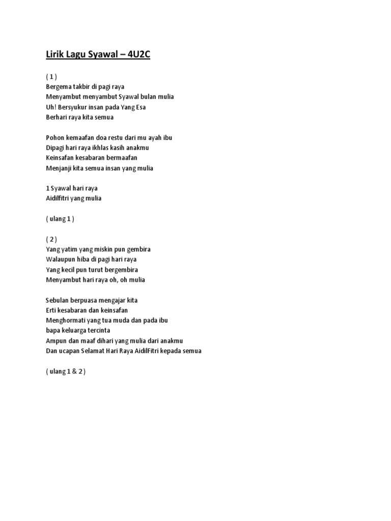 Lirik Lagu Syawal 4U2C. Berikut cuplikan syair nyanyian teks dari lagunya. Salam saudara selamat hari raya.
